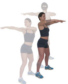 Side Bend Arms Parallel to Floor Bend the knee forward on the extended arm side, keeping the other leg straight, transferring your body weight to the bent leg side. Transfer your bodyweight to your opposite side by straightening your bent leg as you bend your straight leg. At the same time, swing the arms around to help transfer your weight. Keep your back straight throughout, repeating 20 - 40 times in 30 - 60 seconds. |