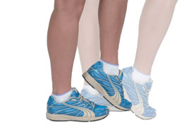 Foot Raise and Heel Raise This action can be performed seated by applying pressure down on your knees with your hands. Progress to a slow walk forward taking small steps placing your heel down first, whilst keeping your toes pointing upwards. Contract your quadriceps as you keep the toes pointing upwards. Take one step every 3 - 5 seconds, spending 1 -3 minutes on each movement. |