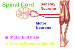 The nervous system supplies muscles with the means to contract (motor), but it also provides it with a second system, which gives feedback (sensory) to the brain, telling it what is going on within the muscle and where. This sensory system includes specialized sensory (stretch) receptors, called “muscle spindles”, and “Golgi tendon organs”, which are capable of detecting the degree of stretch in both the muscle, and its junction with the tendon, respectively. These are very important receptors, as they act as warning systems and will prevent the muscle from damage due to overstretch: as the muscle is stretched the muscle spindles are stretched too. When this happens, the stretch receptors are activated sending a signal to the brain, which initiates a motor impulse to encourage contraction to occur, thus preventing any overstretching of the fibers. This feedback mechanism is called “the reflex arc”.